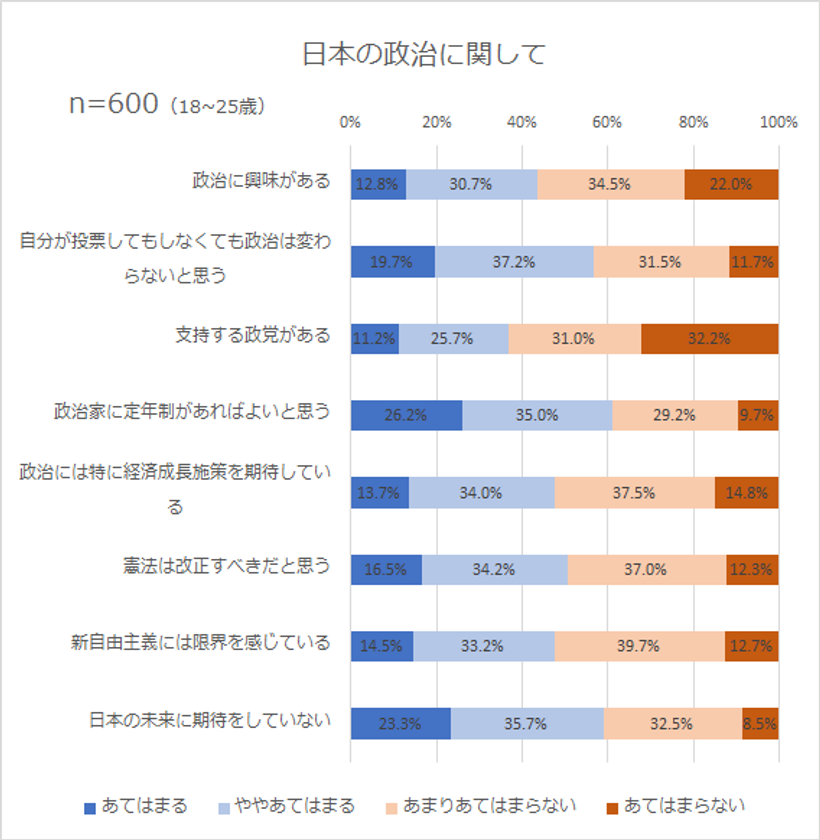 全国の18歳~25歳の男女600人に「日本の政治」に関して複数の質問をしたところ、「政治に興味がある」については、「あてはまる」「ややあてはまる」が43.5%と4割にとどまる結果となった。