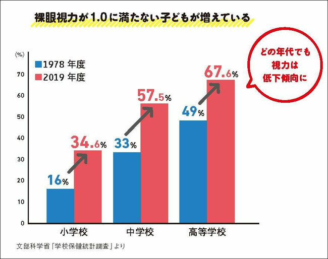 メガネをかけた子どもが増えていると思いませんか? 子どもの視力は数十年にわたって下がり続けています。小学生の3人に1人、中学生の2人に1人は裸眼視力が1.0未満です。