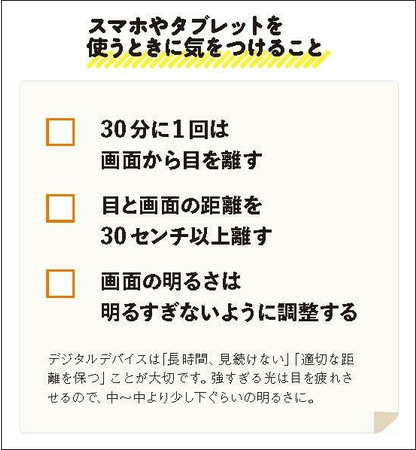 目のために、視力が悪くならないために、すぐに始めてほしいことがあります。「近い距離を長い時間にわたって見続けない」ことです。1.30分に1回は目を休ませる、2.画面との距離を30cm以上離す、3.画面を明るすぎないようにする。酷使している目をいたわってあげてください。