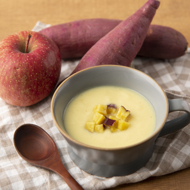 ごろごろとしたさつまいもの食感を残しながらも、口あたりの滑らかさが楽しめるポタージュスープ。一緒に煮込んだりんごのさっぱりとした甘みが野菜の味わいを引き立てます。素朴なさつまいもとりんごの旨味に、自然な甘みの豆乳を合わせました。