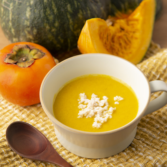 味わい深い冬のかぼちゃをじっくり煮込んだポタージュスープ。アクセントに柿を加え、ユニークな甘みとこの季節ならではの風味が楽しめます。豆乳を使用しポタージュながら重すぎない飲み口を実現しています。たんぱく質摂取だけでなく、お食事としてお腹も満足する鶏そぼろ入り。