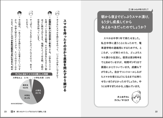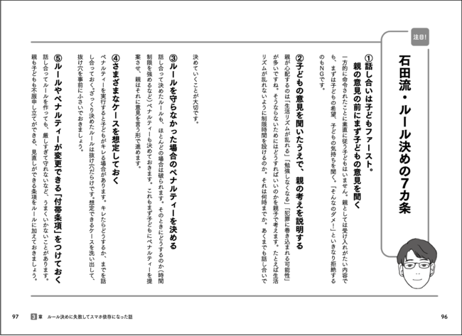 そこで本書では、石田さん流のスマホルール決めのノウハウを詳しく紹介しています。さらに、スマホを持たせるタイミングのアドバイスや、ゲームとの付き合い方、SNSトラブルの対処の仕方まで、子どもとスマホの関わりの中で起こりうるさまざまな親御さんの悩みにアドバイスしています。