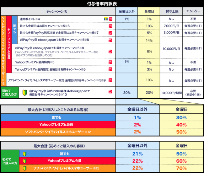 「ebookjapan」では、毎週金曜日であれば誰でも16%相当、プレミアム会員であれば20%相当、ソフトバンクもしくはワイモバイルスマホユーザーであれば最大30%相当のPayPayボーナスが付与されるキャンペーンを実施しています。今回の「超PayPay祭 ebookjapanでお得キャンペーン」と組み合わせることで、期間中の金曜日(2月11日、2月18日、2月25日、3月4日、3月11日、3月18日、3月25日)に対象のお客さまが「PayPay残高」で電子書籍を購入すると、誰でも30%相当、Yahoo!プレミアム会員であれば40%相当、ソフトバンクもしくはワイモバイルスマホユーザーであれば最大50%相当付与されます。また、初めてebookjapanでご購入される方は、追加で+20%相当が付与されるたいへんお得なキャンペーンとなっております。