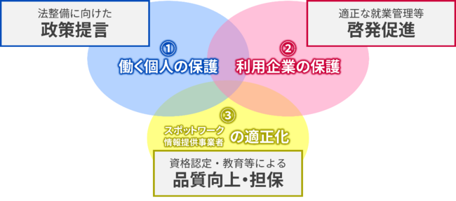 前述のスポットワークにおける現状の課題に対し、下記1.~3.の観点から、法整備に向けた政策提言、適正な就業管理等の啓発促進、資格認定・教育等による品質向上・担保に向けた施策を行ってまいります。