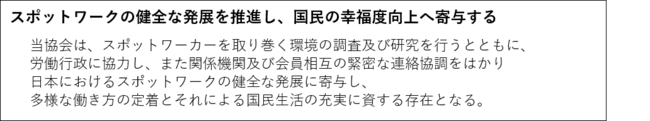 当社は、スポットワークのプラットフォーマーの一員として、このスポットワーク協会の活動に主体的に参画し、参画されるプラットフォーマー事業者との協働により、今後益々増加が予想されるスポットワーカーとして働く個人の保護、ならびにスポットワーカーを活用される企業の保護を最重要課題として、事業に取り組んでまいります。