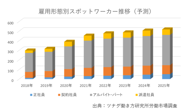 コロナ前300万人に届かなかったスポットワーカーは、コロナ禍を契機に急増。2025年には500万人を超えると予測されます。