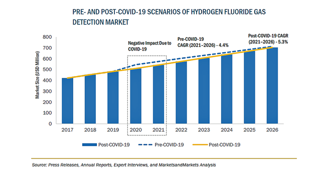 COVID-19パンデミックの発生と拡大は、2020年のフッ化水素ガス検知市場にマイナスの影響を与え、検知機器の出荷が減少しました。その結果、収益が減少し、2020年前半、市場の成長率は低く留まり、この傾向は2021年の第1四半期まで続きました。