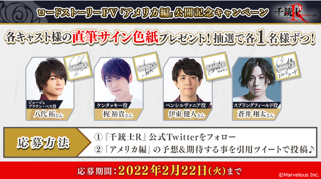 ロードストーリーPV「アメリカ編」の公開を記念して、『千銃士』公式Twitterアカウントでは八代拓さん(ジョージ&ブラウン・ベス役)、梶裕貴さん(ケンタッキー役)、伊東健人さん(ペンシルヴァニア役)、 蒼井翔太さん(スプリングフィールド役)の直筆サイン色紙が当たるフォロー&リツイートキャンペーンを開催しております。応募の締切は2022年2月22日(火)23:59まで!奮ってご応募くださいませ!