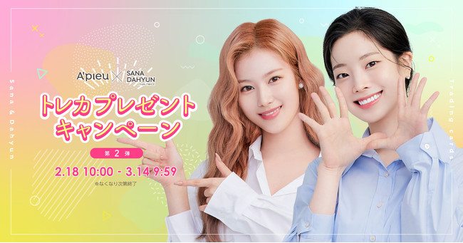 (アピュー)から、対象商品をお買い上げのお客様に、A’pieuのイメージモデルである「TWICE」のサナさんとダヒョンさんのオリジナルトレーディングカードが貰える「TWICEサナ&ダヒョン トレカプレゼントキャンペーン」を実施いたします。キャンペーン期間は、2022年2月18日(金) 10:00~3月14日(月)9:59です。(無くなり次第終了)