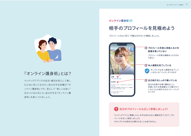 マッチングアプリ「タップル」を運営する株式会社タップル(本社:東京都渋谷区、代表取締役社長:飯塚勇太)は、安心・安全にマッチングアプリを利用するために知っていただきたいことをわかりやすく解説した『マッチングアプリの恋活・オンライン護身術ガイドブック』を無料で公開いたしました。