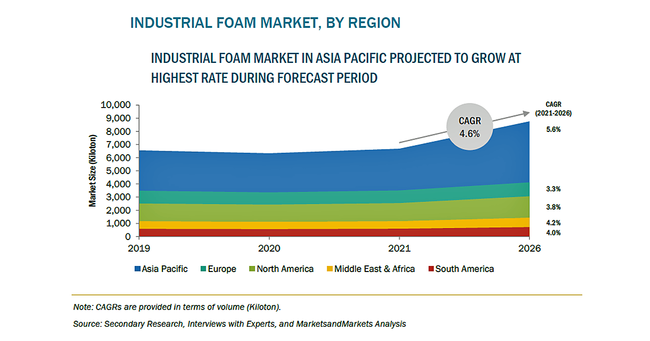 工業用フォームの市場規模は、2021年の556億米ドルからCAGR5.4%で成長し、2026年には722億米ドルに達すると予測されています。同市場は、さまざまなエンドユース産業の成長が推進力となっています。中国、インド、ブラジルでは、インフラへ投資、新規住宅プロジェクト、非住宅ビルの改築などの需要が増加しており、工業用フォーム市場の成長を後押ししています。