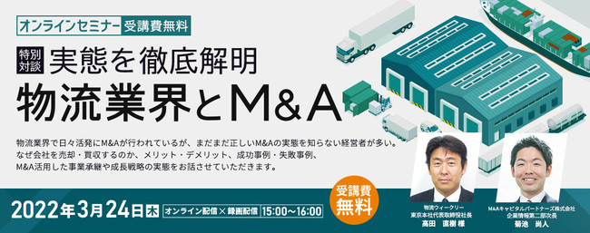 M&Aキャピタルパートナーズ株式会社(東京都千代田区・代表取締役社長 中村悟)は、無料オンラインセミナー「物流業界とM&A(主催:物流ウィークリー、協賛:M&Aキャピタルパートナーズ株式会社)」を2022年3月24日(木)15:00~16:00に開催いたします。