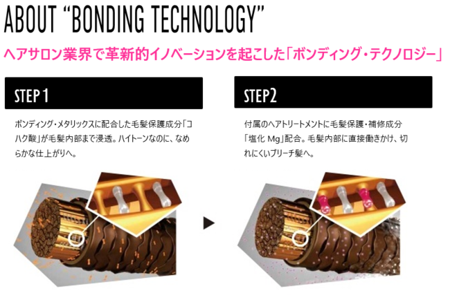 ボンディング・テクノロジーはダメージから髪を保護し、補修する働きがあるので、ブリーチやカラーを重ねても傷みにくく、ダメージから髪をしっかりと守りながらハイトーンカラーを楽しむことができます。
