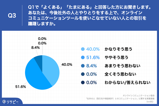 あなたは、今後社外の人とやりとりをする上で、オンラインコミュニケーションツールを使いこなせていない人との取引を躊躇しますか。」(n=95)と質問したところ、「かなりそう思う」が40.0%、「ややそう思う」が51.6%という回答となりました。