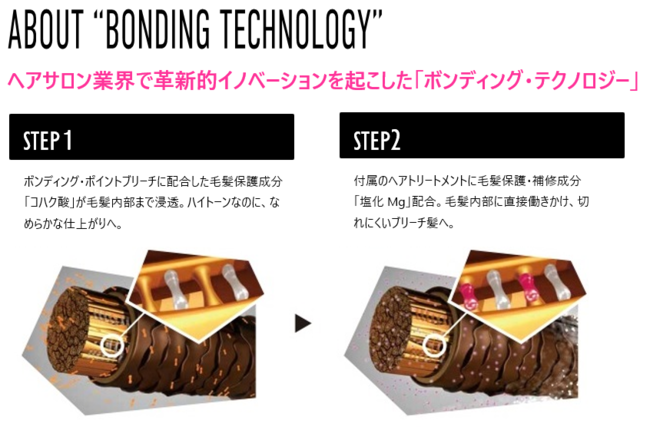 ボンディング・テクノロジーはダメージから髪を保護し、補修する働きがあるので、ブリーチを重ねても傷みにくく、ダメージから髪を守りながらしっかりと髪色を明るくすることができます。。