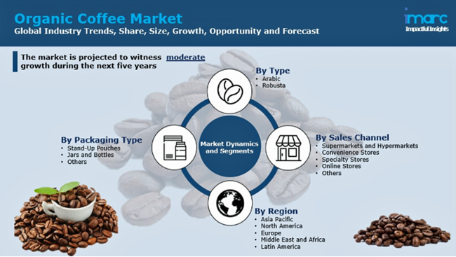 世界的に有機食品・飲料のメリットに対する認識が高まっていることが、市場成長の主な要因の一つです。オーガニックコーヒーは、がんのリスクを低減し、コレステロール値を低下させ、免疫力を高め、体重減少を促進し、神経疾患を予防することが証明されています。また、体内に存在する有害なフリーラジカルを安定化させ、大規模な細胞破壊を抑制することも知られています。このような健康上の利点と、外出先でコーヒーを飲むという新たなトレンドが、オーガニックコーヒーの需要を拡大しています。 さらに、ソーシャルメディアやインターネット、テレビ、新聞などを通じたプロモーション活動が活発化しており、有機食品の利点に関する情報が広まっています。加えて、オーガニックコーヒーは、ベーカリーや製菓、パーソナルケア製品などにも応用されるようになってきています。新興国の若い世代を中心に、欧米文化の急速な浸透や健康志向の高まりにより、オーガニックコーヒーのような健康的な飲料への関心が高まっています。その他、革新的なオーガニックコーヒーや、アイスコーヒー、カフェラテ、カプチーノなどのコーヒー関連のバリエーションが登場したことで、より幅広い消費者層を獲得しています。これらの要因は、今後数年間で市場をさらに牽引すると予想されています。
