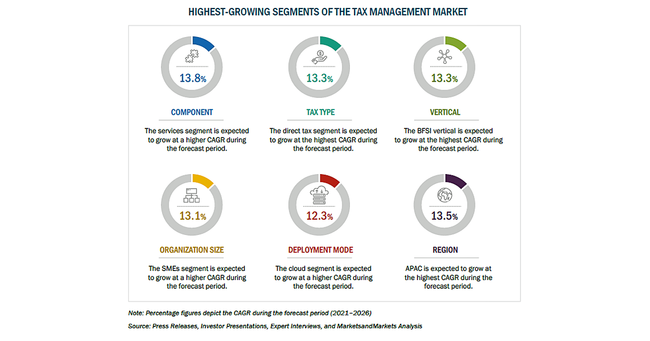 税務管理の市場規模は、2021年の189億米ドルからCAGR11.5%で成長し、2026年には325億米ドルに達すると予測されています。同市場の成長を促進する要因としては、デジタル化に伴う垂直方向の金融取引量の増加、既存の税制の複雑さ、税務管理者の警戒心の高まりなどが挙げられます。また、ブロックチェーン技術の利用などの要因も、税務管理ベンダーに十分な機会をもたらすと予想されます。