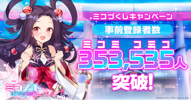 株式会社ドリコム(本社:東京都品川区、代表取締役社長 内藤裕紀、以下、ドリコム)は、スマートフォン向けゲーム『ミコノート はれときどきけがれ(以下、ミコノート)』の事前登録者数が353,535名を突破したことをお知らせ致します。