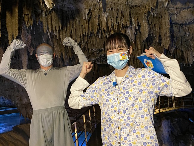 そらとぶピカチュウの風船のようにカラフルな沖縄スペシャルグルメや、『ポケットモンスター ブリリアントダイヤモンド・シャイニングパール』に登場する地下大洞窟のような場所なども思いっきり楽しむ2人。