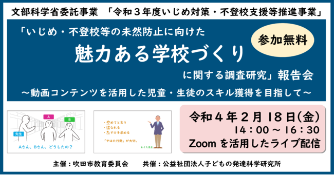 吹田市教育委員会は、令和3年度に文部科学省から受託した「いじめ対策・不登校支援等推進事業」の取り組みについて、2022年2月18日(金)14時から「『いじめ・不登校等の未然防止に向けた魅力ある学校づくりに関する調査研究』報告会」(主催:吹田市教育委員会、共催:公益社団法人子どもの発達科学研究所)をオンラインで開催し、事業成果を発表しました。