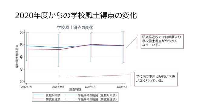 「実施群と比較群では、学校風土、いじめ被害率共に今年度は統計的な差は見られなかったが、実施群も比較群も『いじめ予防プログラム TRIPLE-CHANGE』に取り組んでいることから、昨年度から今年度にかけて、学校風土が向上傾向にある。」という調査結果などが報告されました。