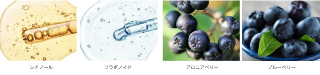 また、エイジングケア*7保湿成分としてレチノール、フラボノイドを配合。うるおい成分のアロニアエキス*8、ブルーベリーエキス*9配合しており、さらにうるおいあふれるツヤ感を与えます。