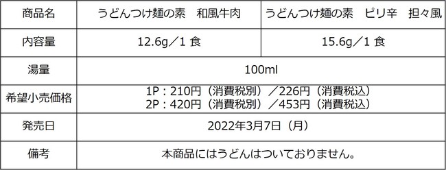 お湯を注ぐだけで“つゆ”と”具材”が完成『うどんつけ麺の素 和風牛肉』『うどんつけ麺の素 ピリ辛 担々風』3月7日新発売