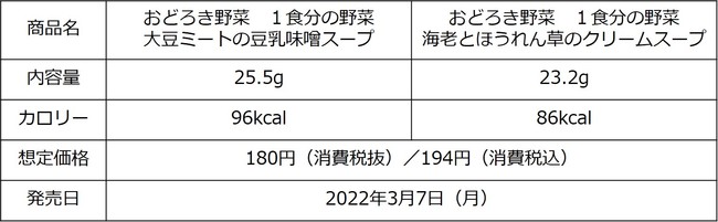 『おどろき野菜 1食分の野菜 大豆ミートの豆乳味噌スープ』『おどろき野菜 1食分の野菜 海老とほうれん草のクリームスープ』3月7日新発売