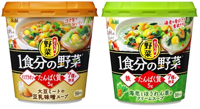 アサヒグループ食品株式会社(本社 東京、社長 川原浩)は、「野菜を食べるスープ」がコンセプトの「おどろき野菜」ブランドから、『おどろき野菜 1食分の野菜 大豆ミートの豆乳味噌スープ』『おどろき野菜 1食分の野菜 海老とほうれん草のクリームスープ』を3月7日より全国で新発売します。