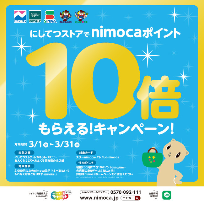 ・期間中、にしてつストア・レガネット・レガネットキュート・スピナ・あんくるふじや・あんくる夢市場の全店舗にて、一度に2,000円以上nimoca電子マネー支払いでお買い物をすると、通常税抜200円につき1ポイントのところ、10倍のnimocaポイントを進呈いたします。(付与上限無し、回数制限無し)