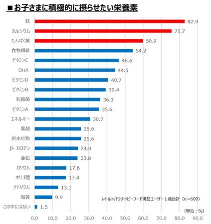 パウチタイプのベビーフードへのニーズを調査したところ、「具材量を増やしてほしい」というニーズがもっとも高く、特に12か月以上のお子さまがいらっしゃる方からの意見が多いことがわかりました※3。また、お子さまに積極的に摂らせたい栄養素について調査した結果、12か月以上のお子さまに摂らせたい栄養素は鉄、カルシウム、たんぱく質が上位3位に挙げられることがわかりました※4。そこで今回、鉄またはカルシウムを強化し、ニーズの高いたんぱく素材を含む具たっぷりの新ラインを発売することで、さらなる市場の活性化を目指します。