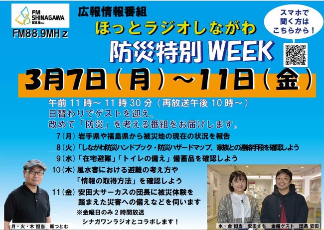 東京都品川区のコミュニティFM局 FM88.9MHz「FMしながわ」で毎週月~金曜日11時(再放送:同日22時)から放送中の品川区広報情報番組「ほっとラジオしながわ」では3月7日~11日、「防災特別WEEK」を実施します。