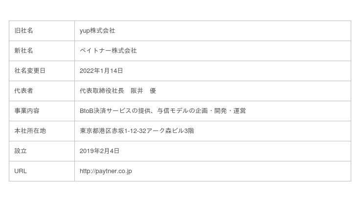 yup株式会社(本社:東京都港区、代表取締役社長:阪井優、以下「yup(ヤップ)」)は、2022年1月14日(木)付けで、社名を「ペイトナー株式会社(以下「ペイトナー(旧yup)」)」に、提供するオンライン型ファクタリングサービス『先払い』のサービス名を『ペイトナー ファクタリング』に変更したことをお知らせいたします。