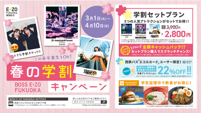 西日本鉄道(株)では、福岡ソフトバンクホークス(株)が運営するBOSS E・ZO FUKUOKA(ボス イーゾ フクオカ)とのタイアップ企画「E・ZO春の学割キャンペーン」を実施します。西鉄バスの学生向けフリー定期券『エコルカード』『ワイドエコルカード』『筑豊エコルカード』をお持ちの学生さんは、BOSS E・ZO FUKUOKAの人気アトラクション入場チケットが22%OFFで購入できます!