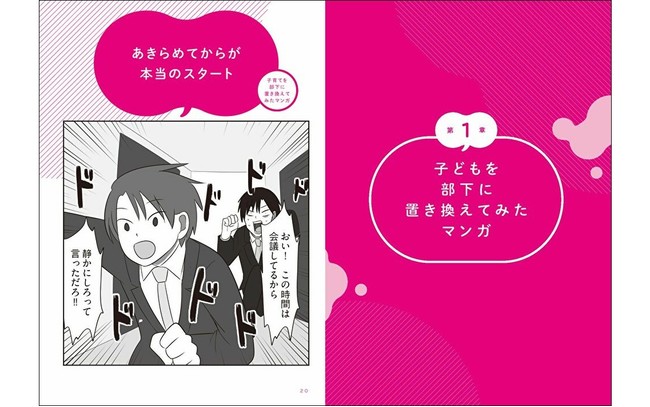 本書は、会社の部下を子どもに置き換えて、子育て中に起こる不測の事態を会社という設定の中でリアルにたとえたマンガである。部下が取引先のお客様に人見知りを発動したり、大事な資料に予告なく落書きをしたり、育児したことがない人でもこの恐ろしい状況が良くわかるため、「共感できる!」「パートナーに読ませたい!」など、反響のコメントが続々と届いている。