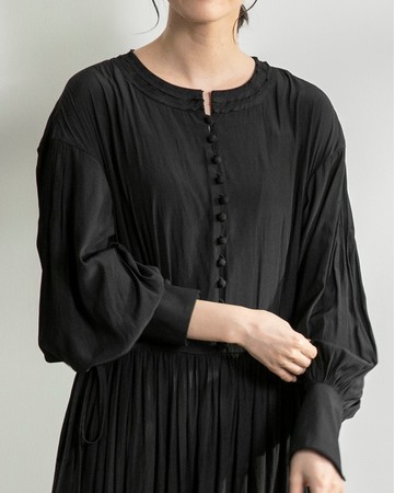 バルーンスリーブと長めの丈を組み合わせ、甘さとクールさの好バランスを実現したブラックドレス。価格:¥47,300