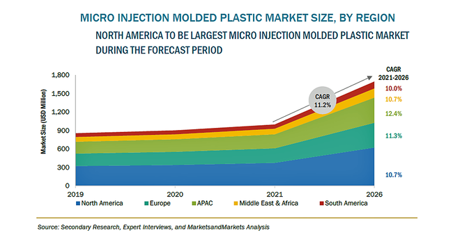 マイクロ射出成形機の市場規模は、2021年の3億8,100万米ドルからCAGR9.8%で成長し、2026年には6億900万米ドルに達すると予測されています。同市場の成長は、自動車分野の成長と医療用途の需要増に牽引されています。医療分野では、ナノテクノロジーや小型化への移行により、医療行為を効率的に行うことができる高精度な金型の需要が高まっています。また、自動車の自動化の進展や電気自動車の導入により、性能向上のための高精度部品の需要がさらに高まっています。マイクロ射出成形機市場は、金額ベースではAPAC(アジア太平洋)が主導しており、欧州、北米、南米、中東・アフリカと続きます。