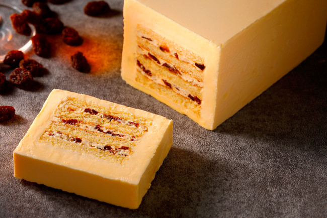 くちどけなめらかに。中にはラムレーズンバタークリームと軽やかなビスキュイの層を閉じ込め、
