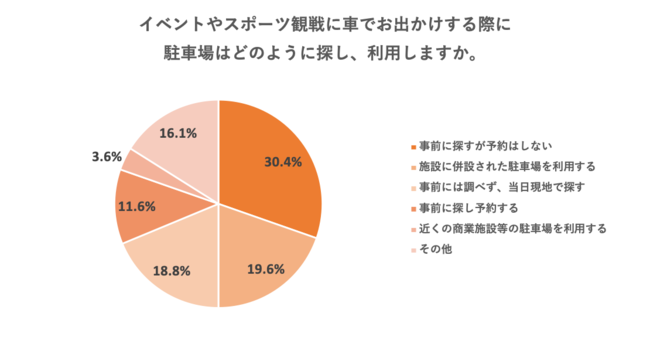 最後に、イベントやスポーツ観戦に車でお出かけする際に駐車場をどのように探し、利用するか質問をしたところ、「事前に探すが予約はしない」(30.4%)、「事前に探して予約をする」(11.6%)と約4割が事前に探していることがわかりました。