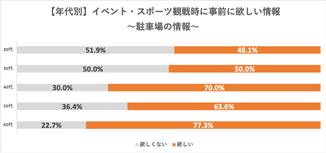 年代別に見てみると、「駐車場の情報」は年代があがるほど欲しいと回答する割合が高くなる傾向にありました。
