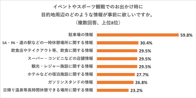 イベントやスポーツ観戦でのお出かけ時に、目的地周辺の欲しい情報を聞いたところ、「駐車場の情報」(59.8%)が最も多い結果となりました。