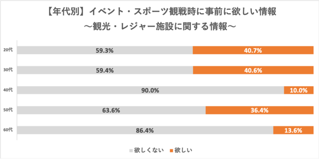 一方で「観光・レジャー施設に関する情報」に関しては、年代が若いほど事前に欲しいという回答割合が高くなる傾向がありました。