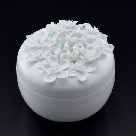 平戸三川内焼の「手捻り」と云われる技法を用いた、繊細で躍動感のある蓋物。ひとつひとつ手作業で丁寧に細工を施し、桜の花が満開になる様子を表現したボンボニエールです。