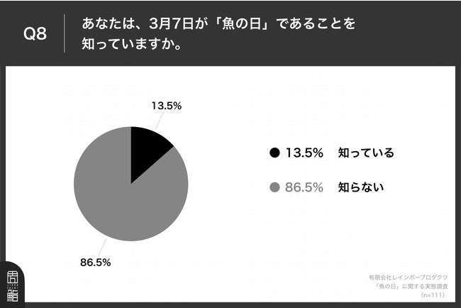「Q8.あなたは、3月7日が「魚の日」であることを知っていますか?」(n=111)と質問したところ、「知っている」が13.5%、「知らない」が86.5%という回答となりました。