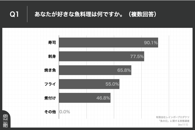 「Q1.あなたが好きな魚料理は何ですか?(複数回答)」(n=111)と質問したところ、「寿司」が90.1%、「刺身」が77.5%、「焼き魚」が65.8%という回答となりました。