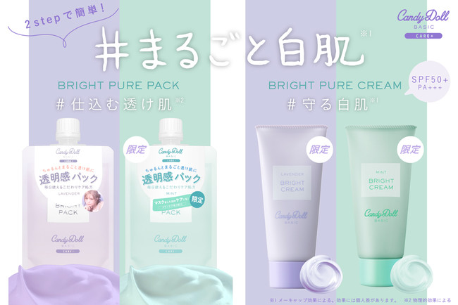 誰でも白肌(※1)を叶えるCandyDollのブライトピュアシリーズから、塗って洗い流すだけで、メイク前の素肌からワントーン明るい肌(※2)を目指せる洗い流しパック、1本で紫外線カットもトーンアップ(※1)もできるボディ用トーンアップUVの2商品が今年も登場します。