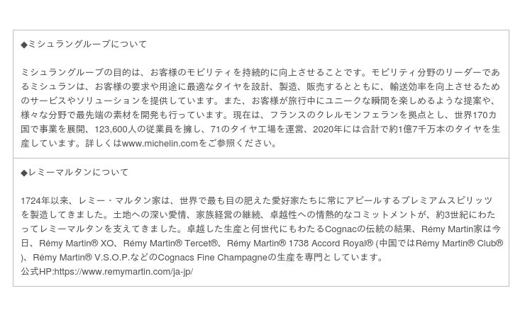 レミーマルタンは、1724 年にフランス コニャックで創業し、その後約300 年にわたり「時間」「テロワール」「人」という3つの価値観を大切にしながら、高品質なフィーヌ・シャンパーニュ・コニャックのみを生産し続けています。一方ミシュランガイドは、100年以上にわたり世界のさまざまな地域の食文化や卓越した料理を生み出すシェフの才能を見出し、紹介してきました。そして、このたび、ミシュラングリーンスターの独占的なサポーターであるレミーマルタンとミシュランガイドは、持続可能なガストロノミーを推進し、世界中で活躍するシェフによるインスピレーションあふれる“グリーンレシピ”を紹介するプロジェクトを実施いたします。
