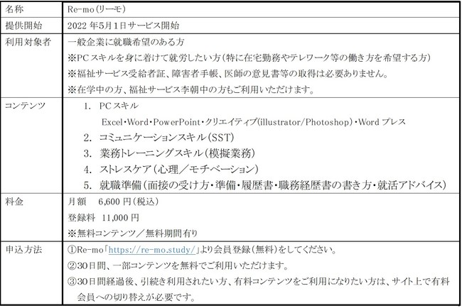 そこで当社は、アフターコロナの働き方を見据えた取り組みとして、一般企業に就労したい方を対象に誰もが今いる場所で学べるe-learningに、就労移行支援のノウハウを組み合わせた新サービスとして、オンライン就労支援「Re-mo」の開発を行いました。