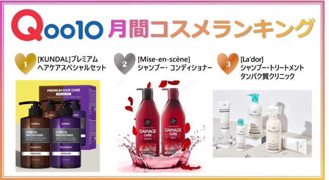 Qoo10(https://www.qoo10.jp/)サイト上、「シャンプー&コンディショナー」「リップ」「アイシャドウ」「チーク」カテゴリーの各販売個数に基づいたランキングです。