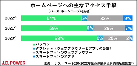 ホームページへのアクセス手段は依然として「パソコン」が最も多いが、「スマートフォン」が増えている。2020年には「パソコン」が68%であったが年々減少し、本調査では54%となった。一方、「スマートフォンのウェブブラウザー」は2020年の25%から本調査では32%に、「スマーフォンのアプリ」は2020年の2%から本調査の9%とそれぞれ増加し、スマートフォン計では2020年の27%から本調査では41%にまで増えている。ただし、「スマートフォン」での利用者の大半は「アプリ」ではなく、「ウェブブラウザー」が中心となっている。